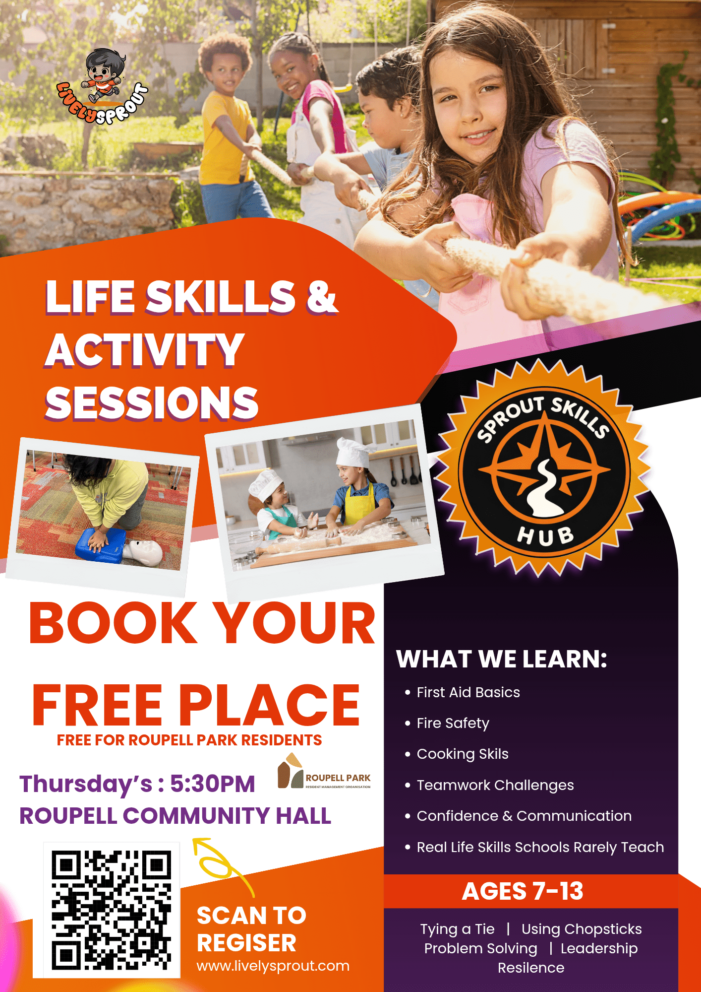 Sessions include first aid basics, cooking, teamwork challenges, leadership and problem solving. Designed to support independence and resilience in a fun, supportive space.